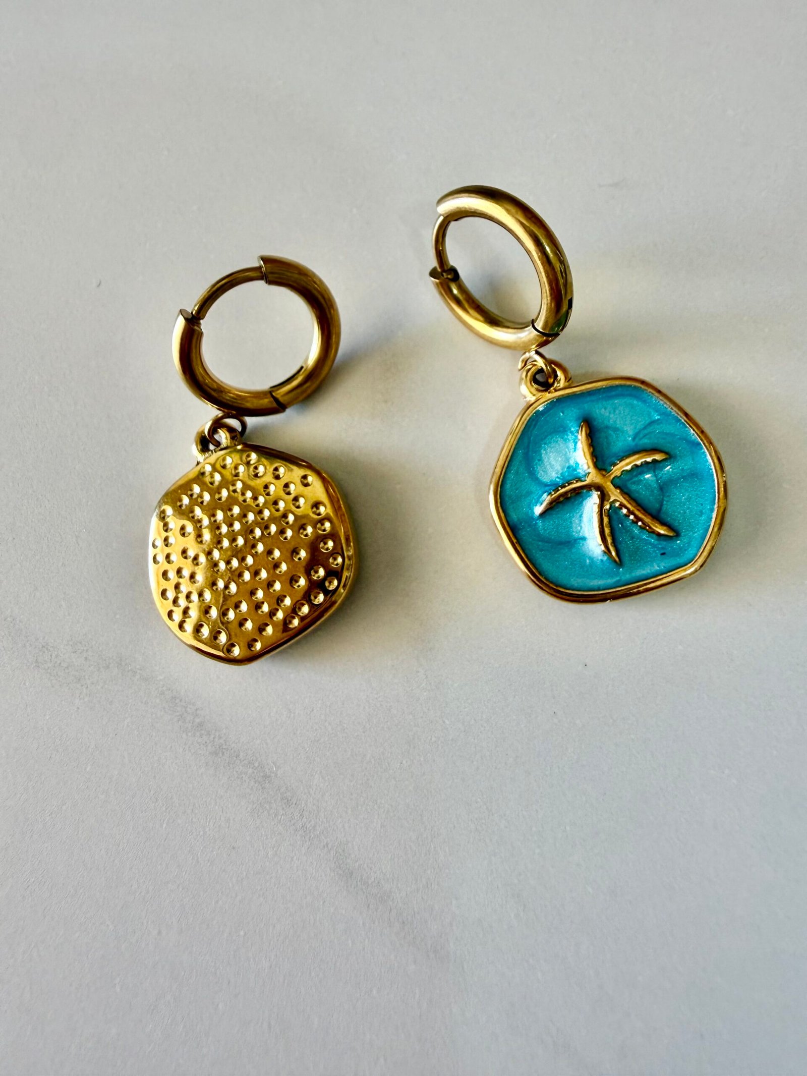 Los Pendientes Llafranc estĆ”n inspirados en la esencia del MediterrĆ”neo. Su diseƱo combina un aro dorado con un colgante en tono turquesa y una delicada estrella de mar en relieve, evocando el mar, la arena y los dĆas de verano.