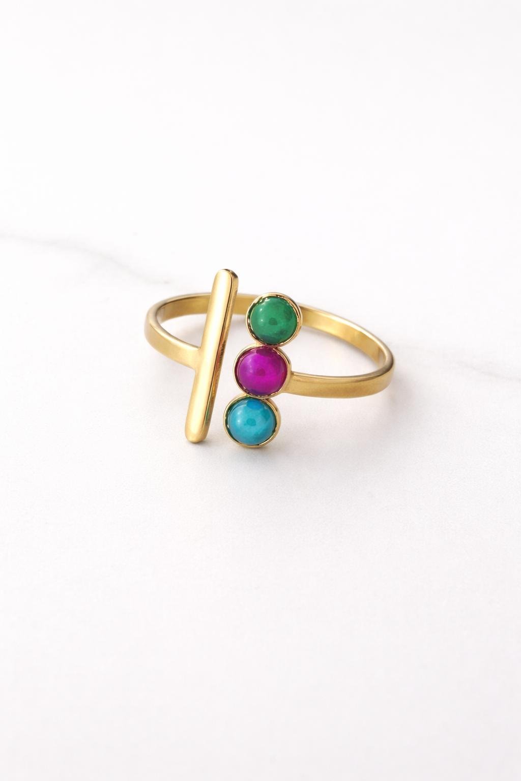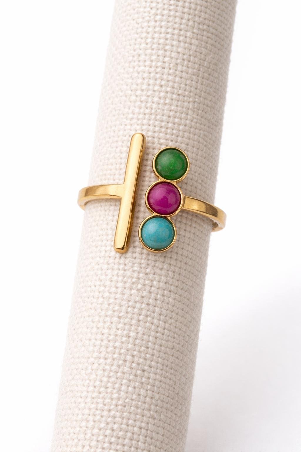 Anillo dorado con detalles de colores vibrantes y diseño moderno.