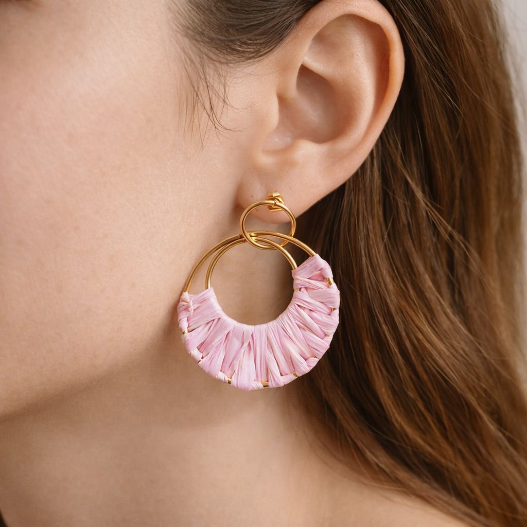 Aros dorados con detalle trenzado en rafia rosa pastel.