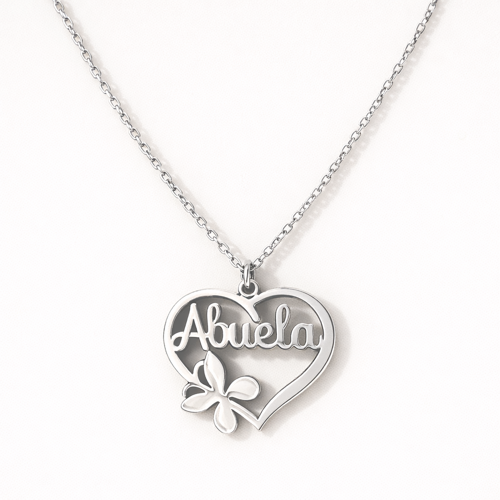 El Collar Abuela es una joya emotiva y especial con diseño de corazón y detalle floral, perfecta para regalar a alguien único.