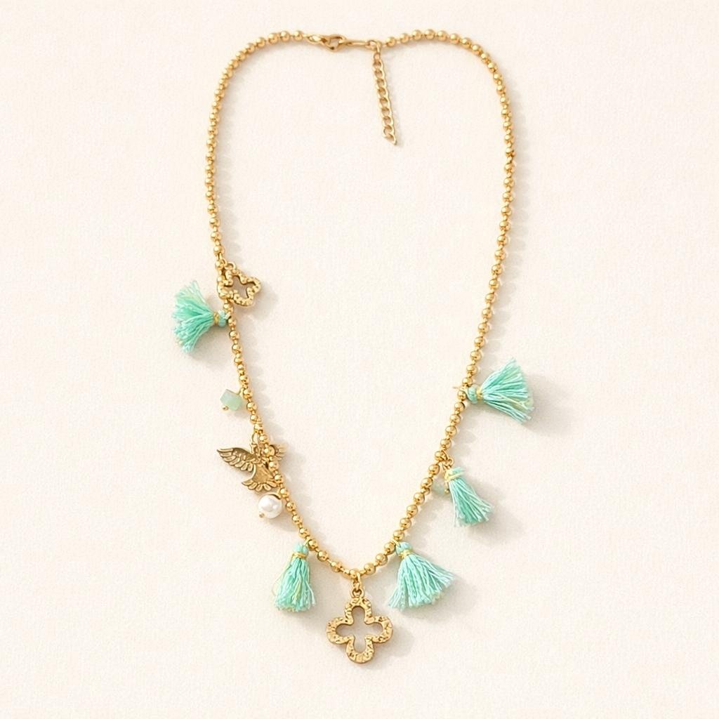 Los delicados colgantes decorativos aportan un detalle elegante que hace de esta pieza un collar original y lleno de estilo. Es perfecto para completar looks veraniegos, outfits relajados o para añadir un toque mediterráneo a cualquier conjunto.