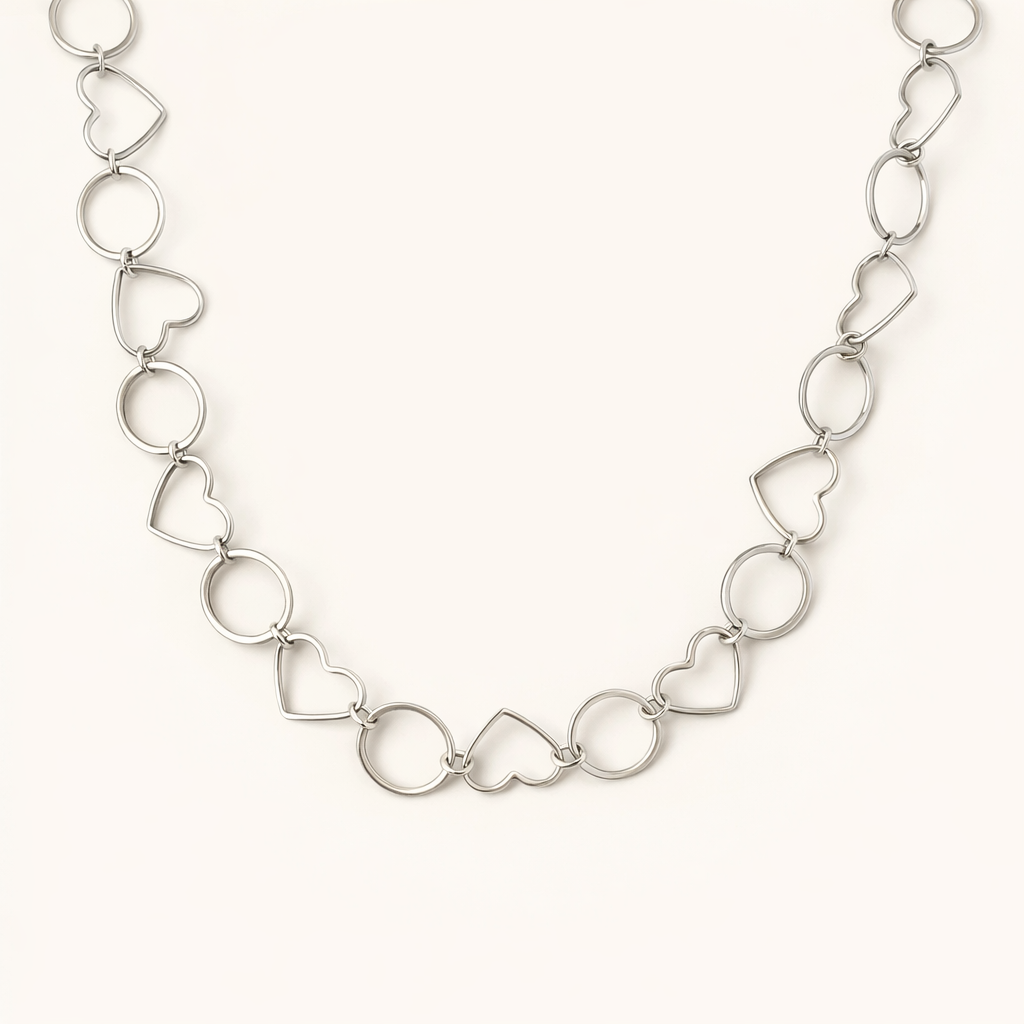 El Collar Chiara es un collar moderno y romántico con eslabones de corazones que aporta un toque especial y elegante a cualquier look.