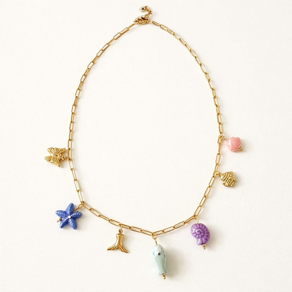 • Diseño: Cadena con charms marinos (estrella, concha, tortuga, peces)