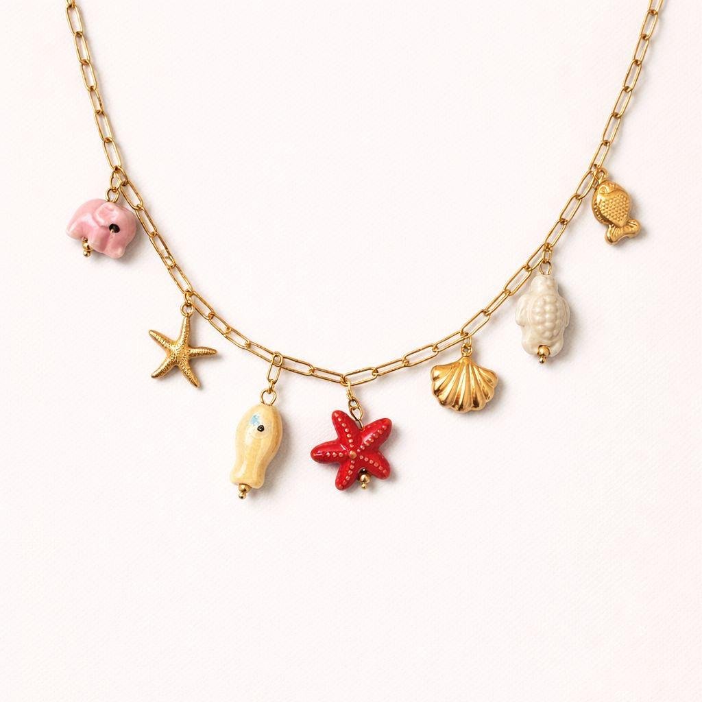 El Collar Nadine es una pieza llena de encanto inspirada en el mar. Su diseño combina una cadena dorada con pequeños charms en forma de estrella de mar, conchas, tortuga y peces en tonos pastel, creando un collar divertido, delicado y muy especial.