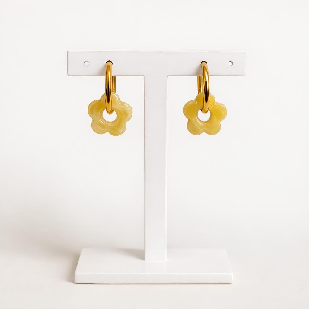 Los Pendientes Amara combinan un elegante aro dorado con un delicado colgante en forma de flor amarilla, creando una joya fresca, femenina y llena de estilo.