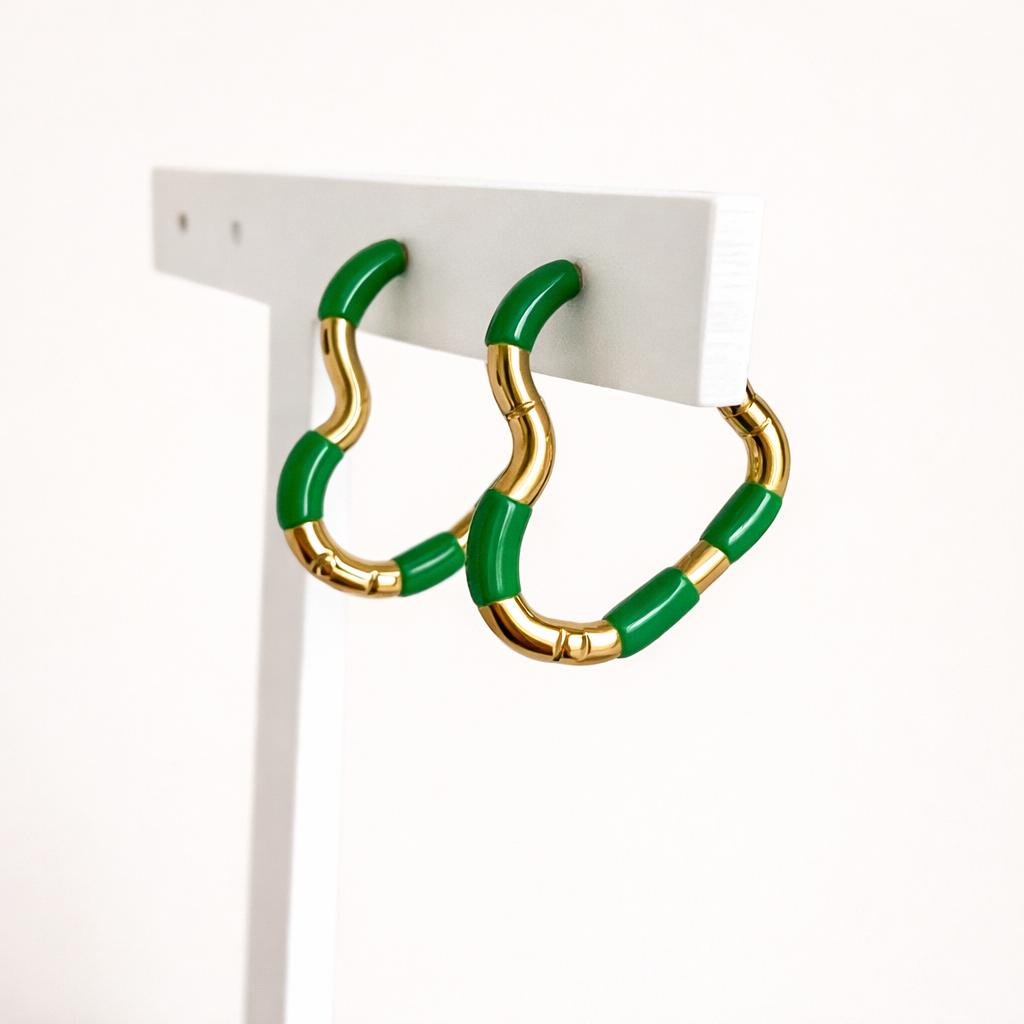 Los Pendientes Freya combinan elegancia y personalidad en un diseño en forma de corazón que simboliza amor, alegría y energía. Sus detalles en color verde crean un contraste vibrante con el metal dorado, aportando un estilo fresco y moderno.