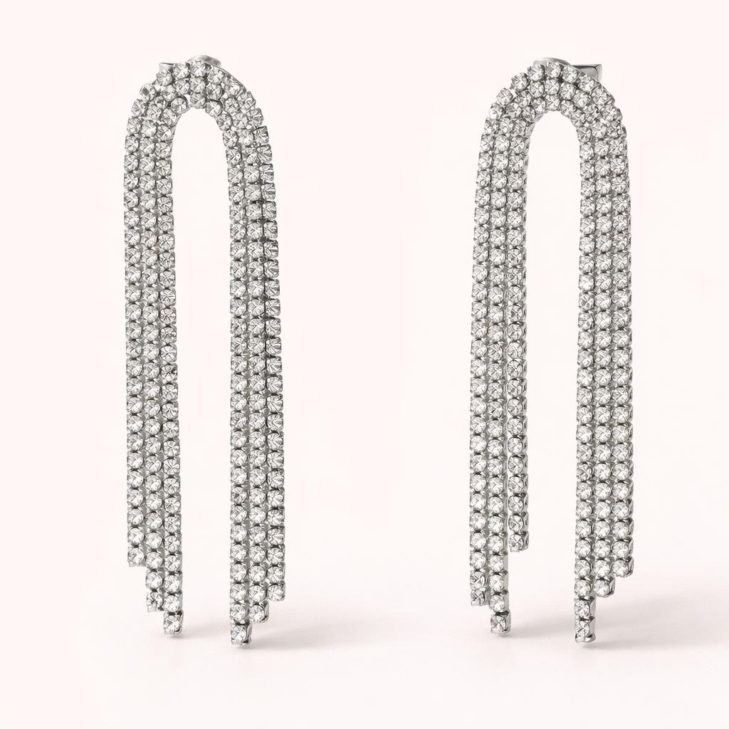 Pendientes largos con cascada de circonitas brillantes en acabado plateado. Sofisticados y llamativos, ideales para ocasiones especiales.