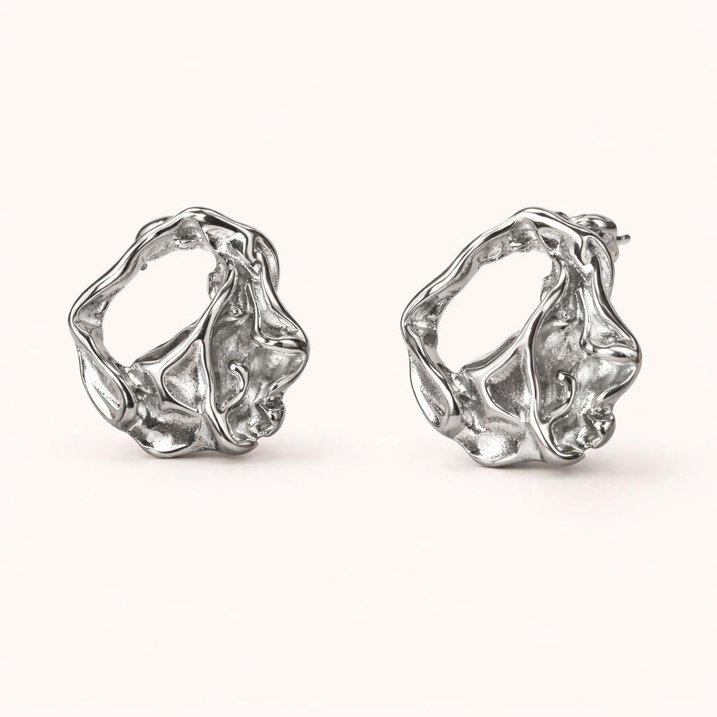 Pendientes de acero inoxidable con diseño orgánico y acabado plateado pulido. Una pieza moderna y elegante que aporta carácter y sofisticación.