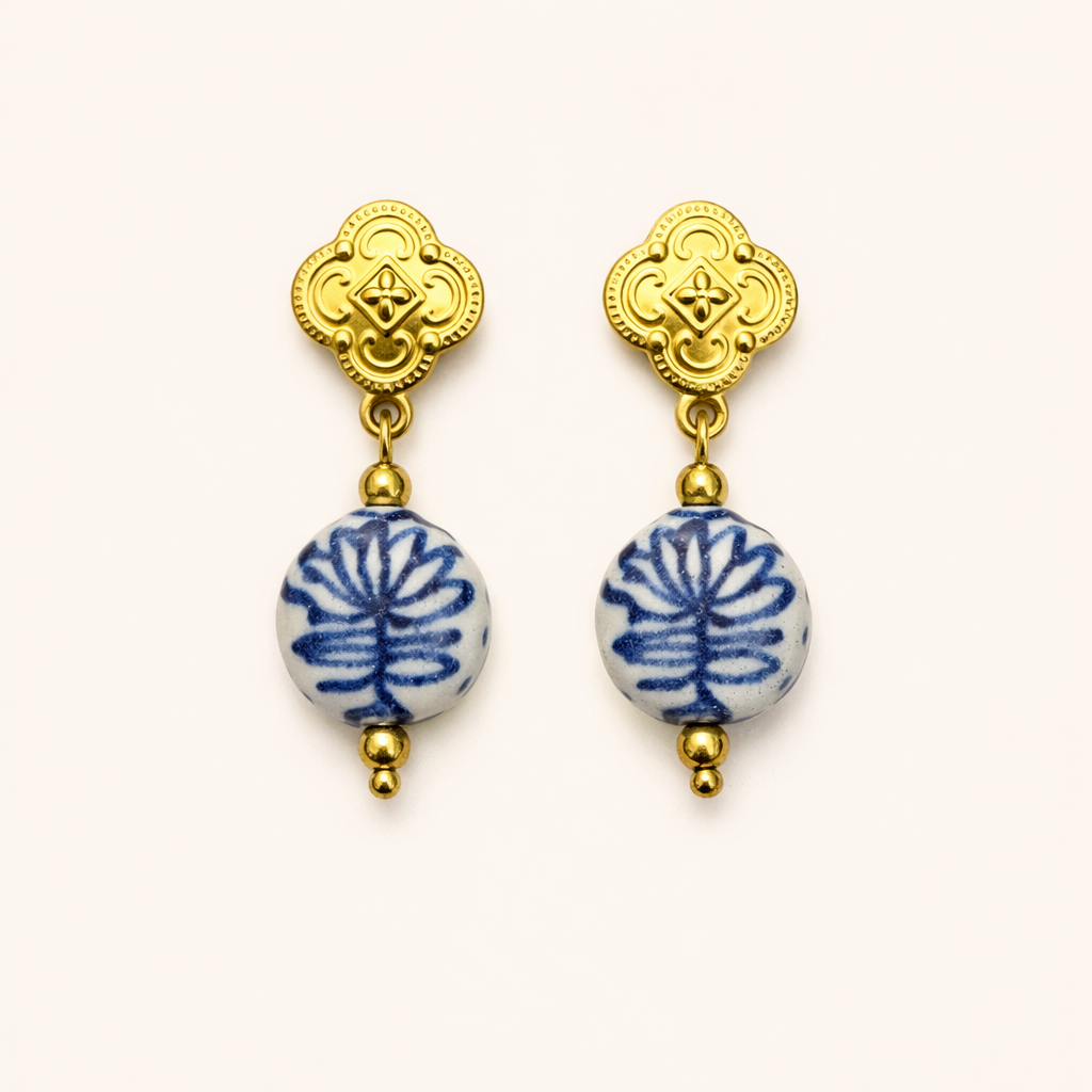 Los Pendientes Maribel destacan por su diseño refinado con inspiración tradicional. Su parte superior en acabado dorado, con detalles grabados de estilo vintage, aporta carácter y distinción. El colgante esférico en tonos blancos con delicados motivos azules recuerda a la cerámica clásica, creando una combinación elegante y muy especial.
