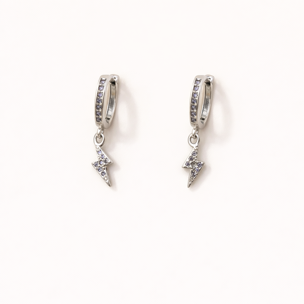 Los Pendientes Rayo combinan un aro con circonitas brillantes y un pequeño colgante en forma de rayo, creando una joya moderna, elegante y con personalidad.