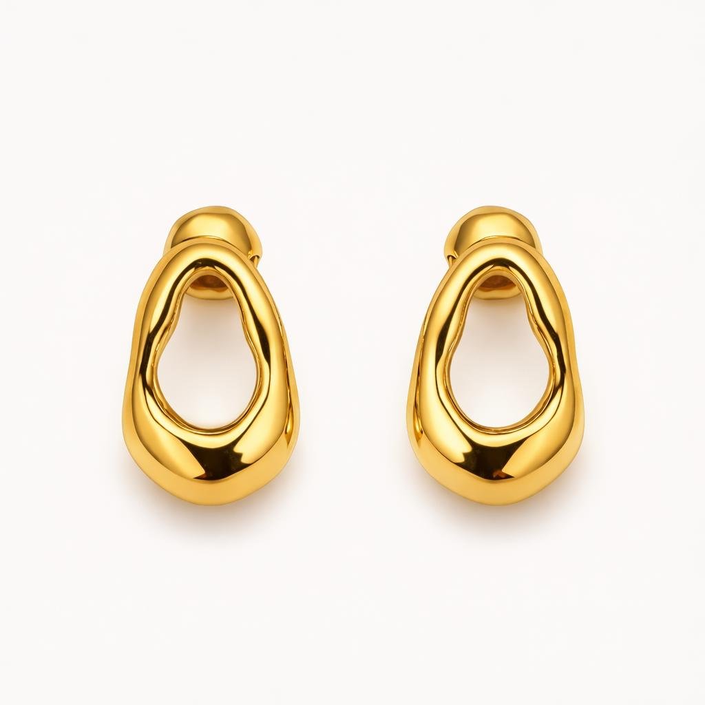 Los Pendientes Roma presentan un diseño fluido y contemporáneo con forma irregular que aporta un toque artístico y diferente. Su acabado dorado brillante los convierte en una joya versátil, perfecta tanto para looks diarios como para ocasiones especiales.